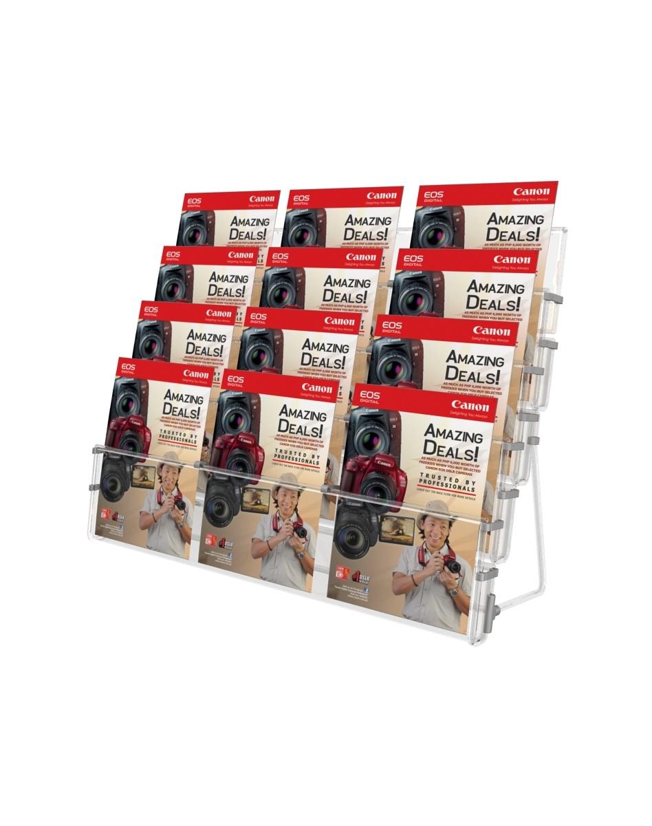 Zestaw trzech stojaków z dwunastoma kieszeniami A6, wykonany z plexi do postawienia na biurku lub stole.